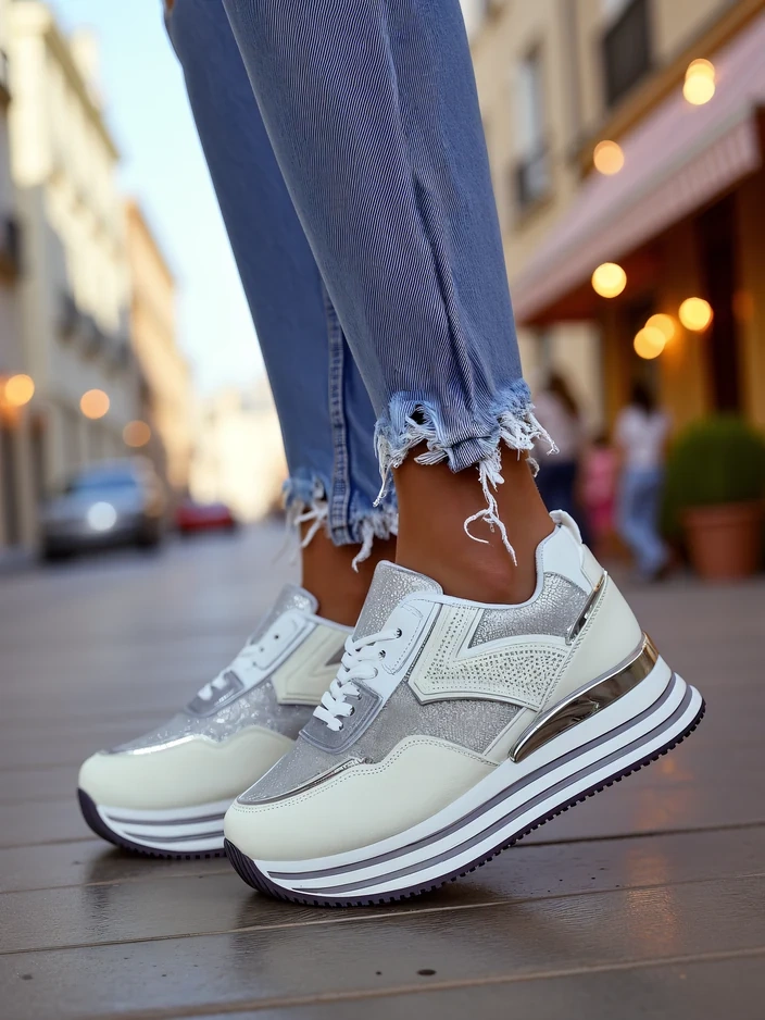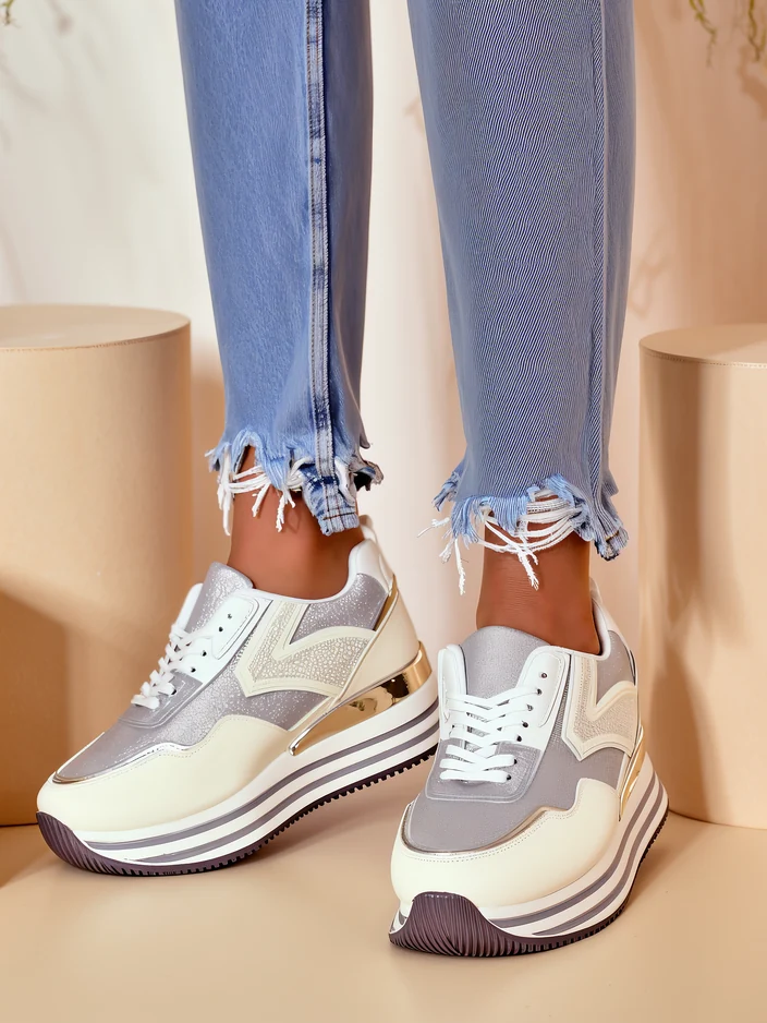 • Chaussures de sport pour femmes au style sneaker avec une semelle plus épaisse. Fabriquées en éco-cuir et matériau pailleté avec une semelle intérieure en tissu. Un excellent ajout à vos tenues décontractées quotidiennes !