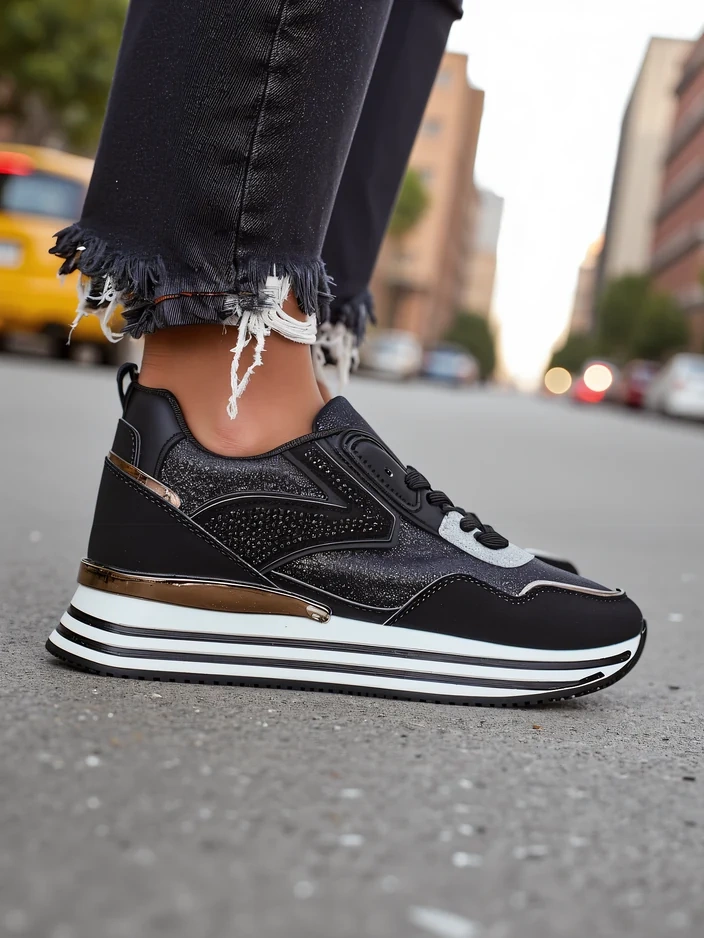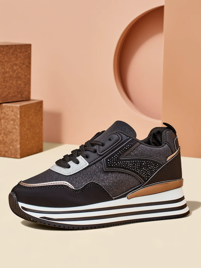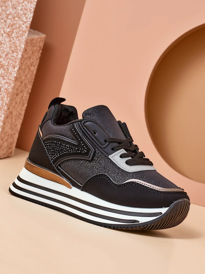 - Chaussures de sport pour femmes au style sneaker avec une semelle plus épaisse. Fabriquées en éco-cuir et matériau pailleté avec une semelle intérieure en tissu. Un excellent ajout à vos tenues décontractées quotidiennes !
