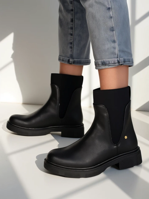 - Incroyables bottines pour femmes avec un talon plat, en éco cuir. L'intérieur est réalisé en semelle en tissu. Les inserts élastiques sur les côtés assurent un ajustement parfait !