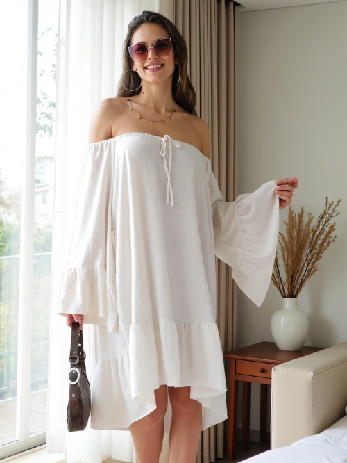 - Magnifique robe a'la Espagnole, fabriquée en tissu léger et aéré. Modèle mi-long avec des manches longues ornées de volants et un décolleté élastique qui met en valeur la silhouette. Pleine de charme et de légèreté !
