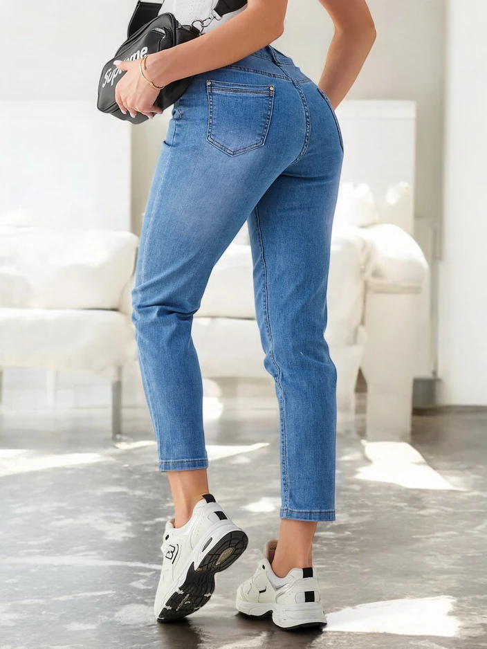 - Jeans mom tendance en coton pour femmes. Le modèle présente une taille haute, un bouton et une fermeture éclair, ainsi que 4 poches. Un indispensable dans chaque garde-robe !