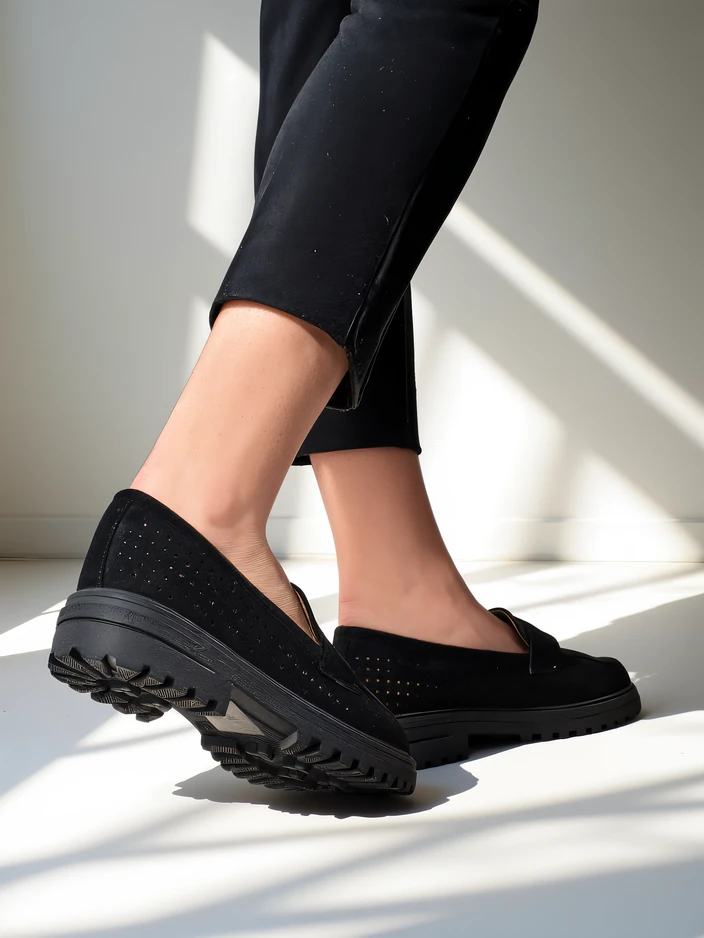 - Mocassins perforés pour femmes sur une semelle plate. Modèle en cuir suédé écologique avec une doublure en cuir écologique. Un ajout idéal à vos tenues quotidiennes !