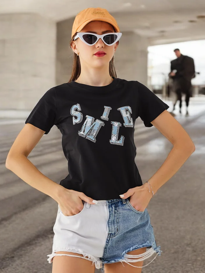 - Blouse originale pour femmes avec un col rond, fabriquée à partir d'un tissu doux et agréable au toucher. L'ensemble est décoré d'une inscription subtile, et les manches courtes ajoutent de la légèreté. Un choix parfait pour créer des tenues à la mode et