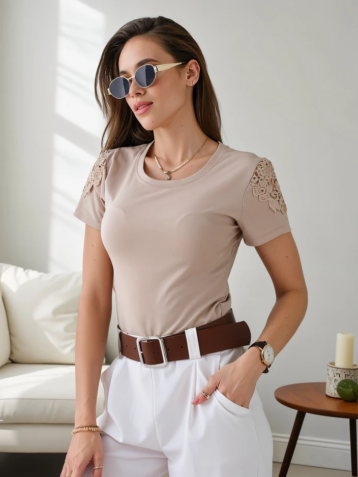 - Chemisier original pour femmes avec un col rond, fabriqué dans un tissu doux et agréable au toucher. Le modèle est décoré d'inserts en dentelle accrocheurs, et les manches courtes apportent de la légèreté. Un choix parfait pour créer des tenues à la mode