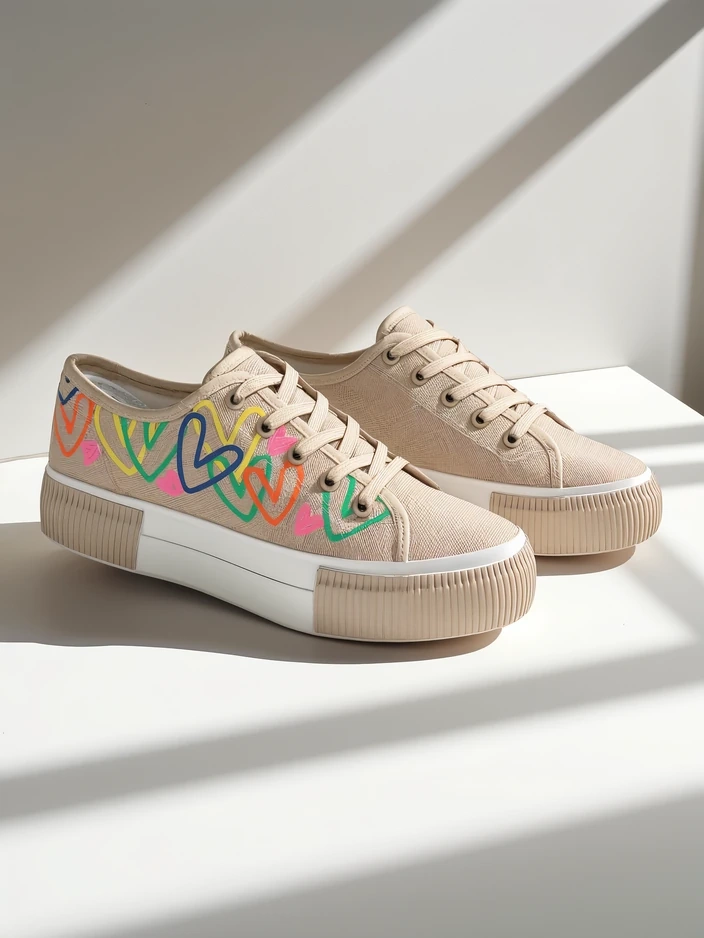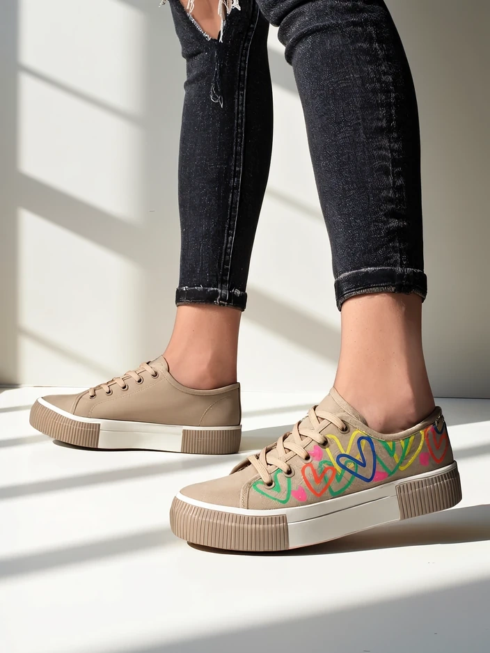 • Baskets pour femmes en matière textile. La tige est lacée et ornée d'un imprimé cœur. La semelle est en caoutchouc classique. Ces chaussures seront parfaites pour un usage quotidien !