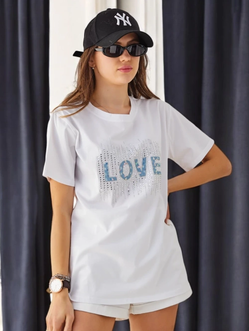 Royalfashion T-shirt en coton pour femmes LOVE avec des strass