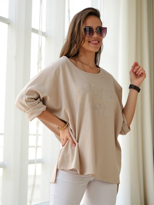 - Blouse originale pour femme avec un col rond, fabriquée dans un tissu doux et agréable au toucher. L'ensemble est décoré d'une subtile inscription en strass, et les manches longues ajoutent de la légèreté. Un excellent choix pour créer des tenues à la mod