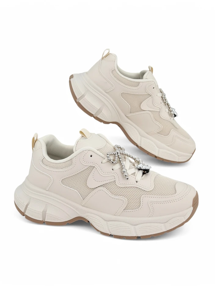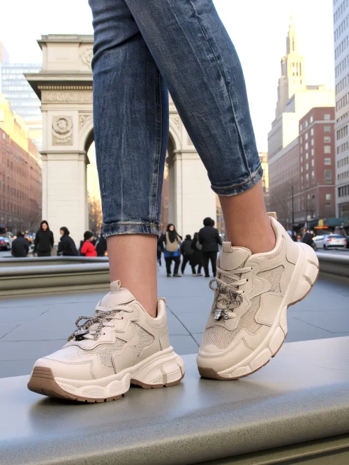 - Chaussures de sport pour femmes en cuir écologique et maille. Modèle sur une semelle plus épaisse. Empeigne à lacets. Elles s'accorderont parfaitement avec des tenues quotidiennes ! Décorées d'une chaîne amovible.