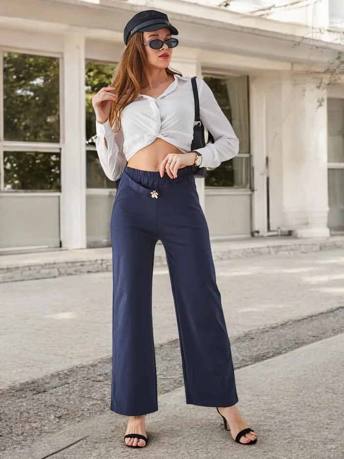Pantalons larges en coton pour femmes Royalfashion avec embellissement en forme de ceinture