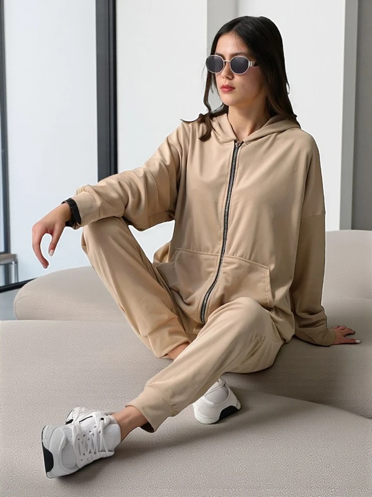 - Ensemble velours pour femmes en matériau agréable. Sweat à capuche zippé. Pantalons longs avec une taille élastique, 2 poches. Soyez élégante dans cet ensemble merveilleux !