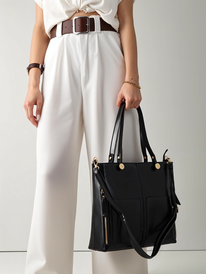 - Grand sac à main pour femmes en éco-cuir et à fermeture éclair. Le modèle comprend : - 1 compartiment avec un séparateur - 5 poches externes, - 4 poches internes ;
