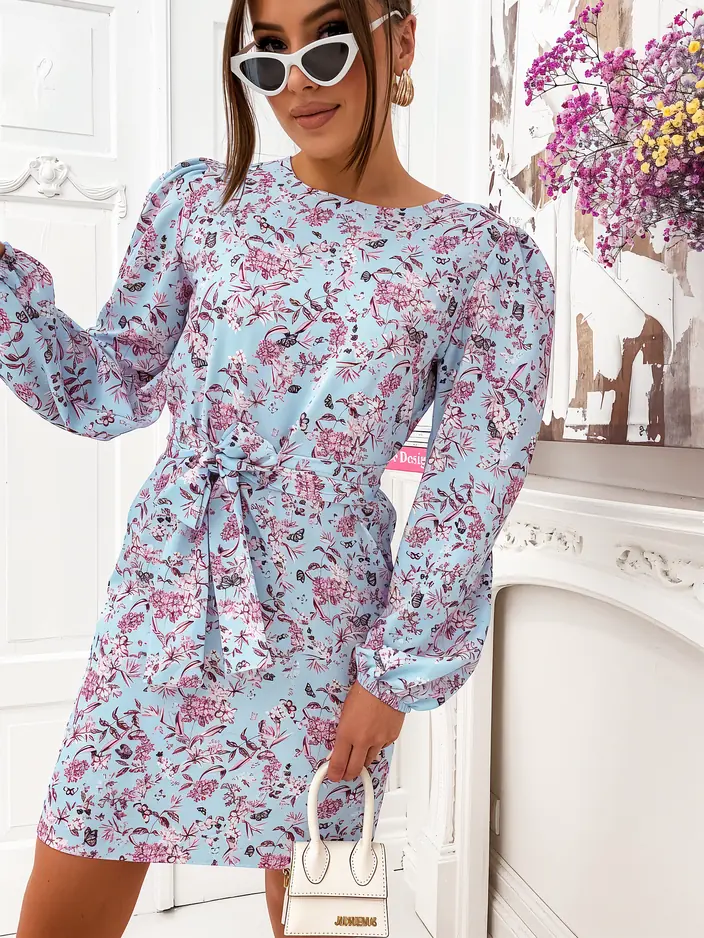 Robe mini florale Royalfashion pour femmes avec manches bouffantes et ceinture