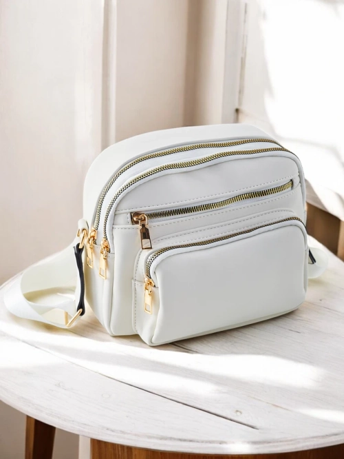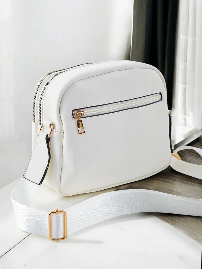 • Petit sac à fermeture éclair pour femmes en simili cuir. Le modèle dispose de 2 compartiments et de 3 poches externes. De plus, il est doté d'une sangle détachable et réglable. Parfait pour un usage quotidien !