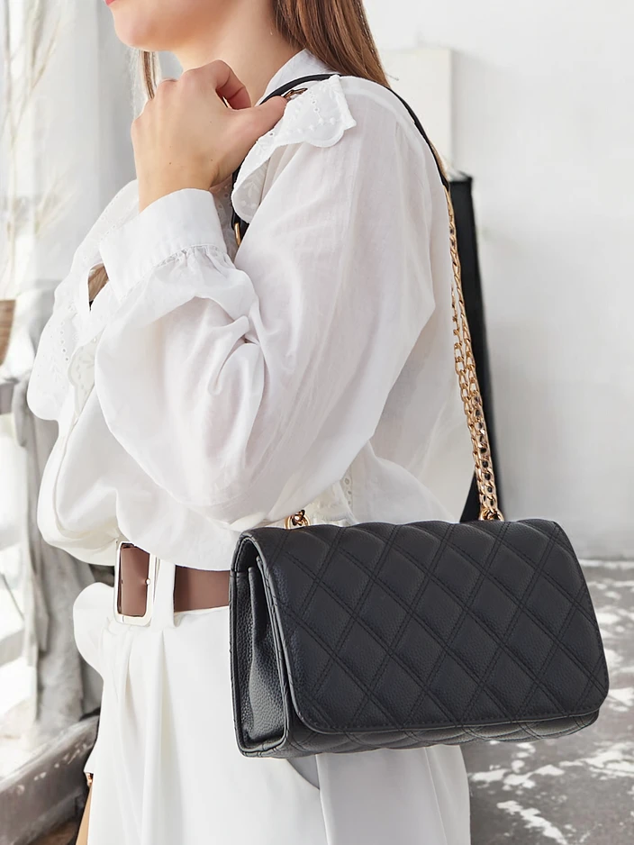 - Élégant petit sac à main matelassé avec fermeture magnétique, fabriqué en éco-cuir. Le modèle dispose d'un compartiment avec un séparateur. De plus, il est muni d'une magnifique chaîne. Parfait pour un usage quotidien !
