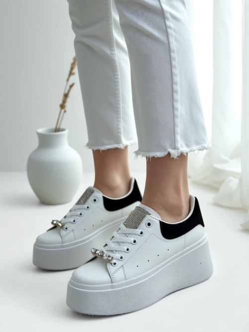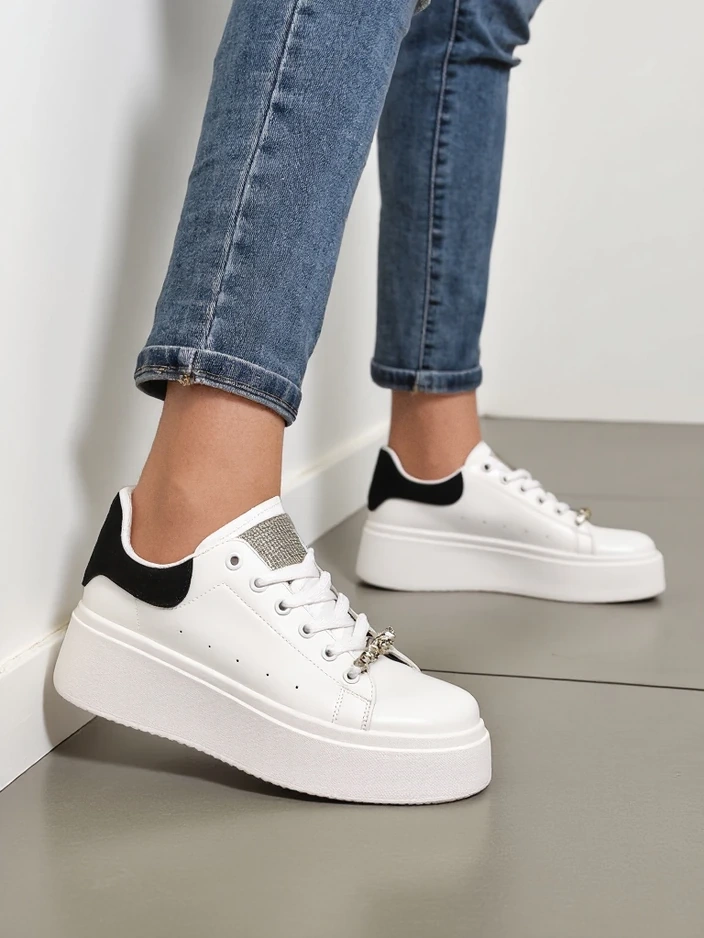 - Baskets blanches élégantes avec des détails métallisées scintillants. Chaussures en éco-cuir et inserts en tissu. Parfaites pour des tenues décontractées.