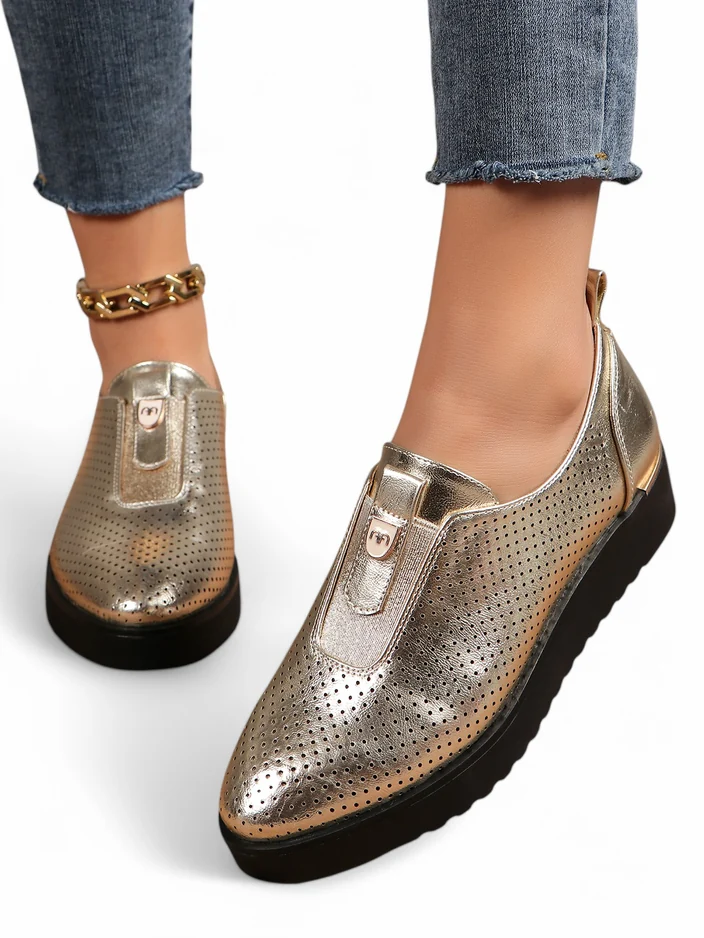 - Chaussures perforées pour femmes sur une semelle plus épaisse. La tige enfilée est en éco-cuir, la semelle intérieure est en éco-cuir. Une base idéale pour les tenues de tous les jours !