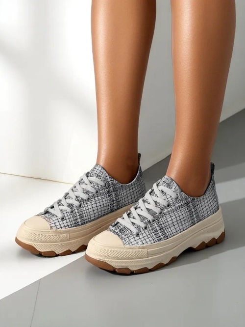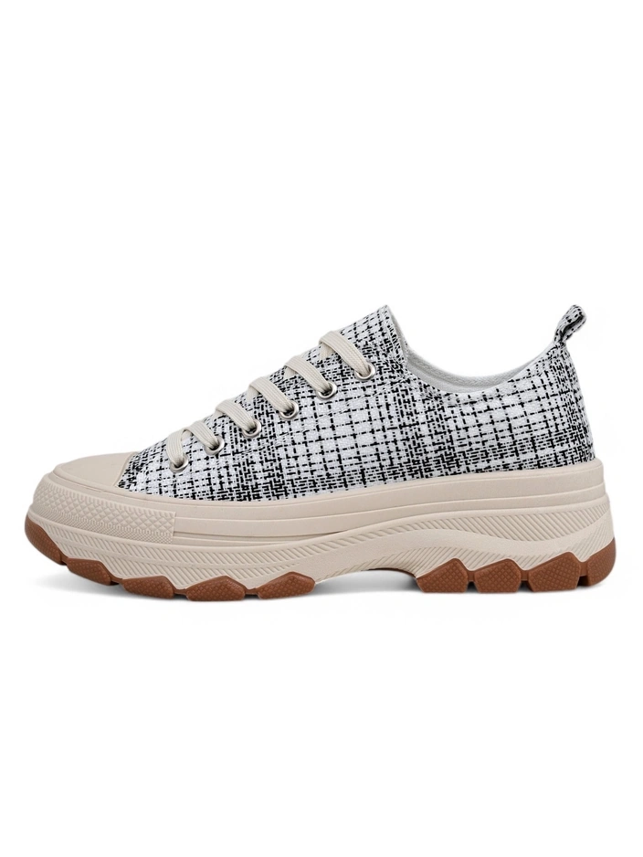 - Baskets pour femmes élégantes en matériau tissu. Modèle sur une plateforme confortable. La tige est lacée. Idéal pour créer des tenues décontractées !