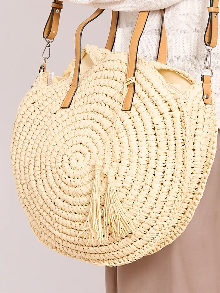 • Grand sac en osier rond. Très spacieux, doublé à l'intérieur avec du tissu. Le sac se ferme avec une fermeture éclair.