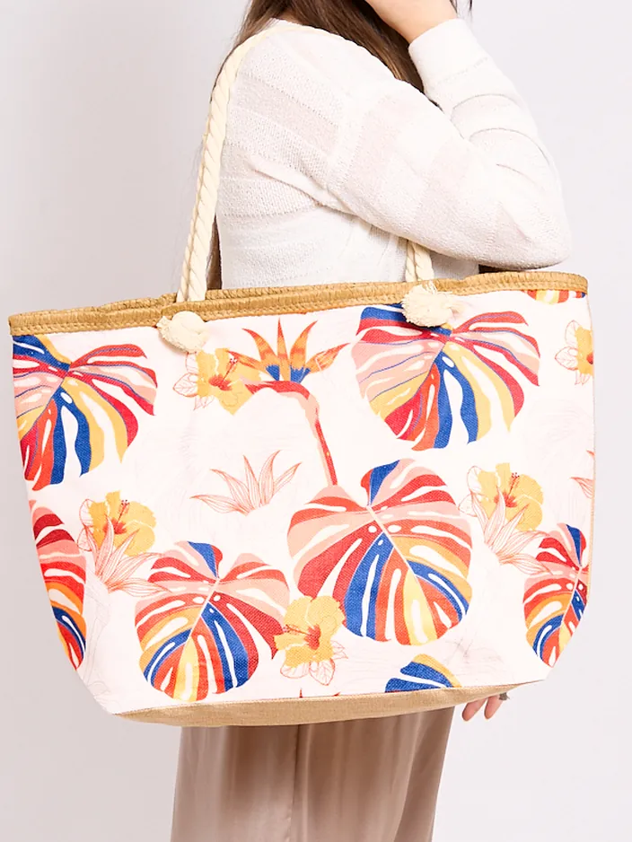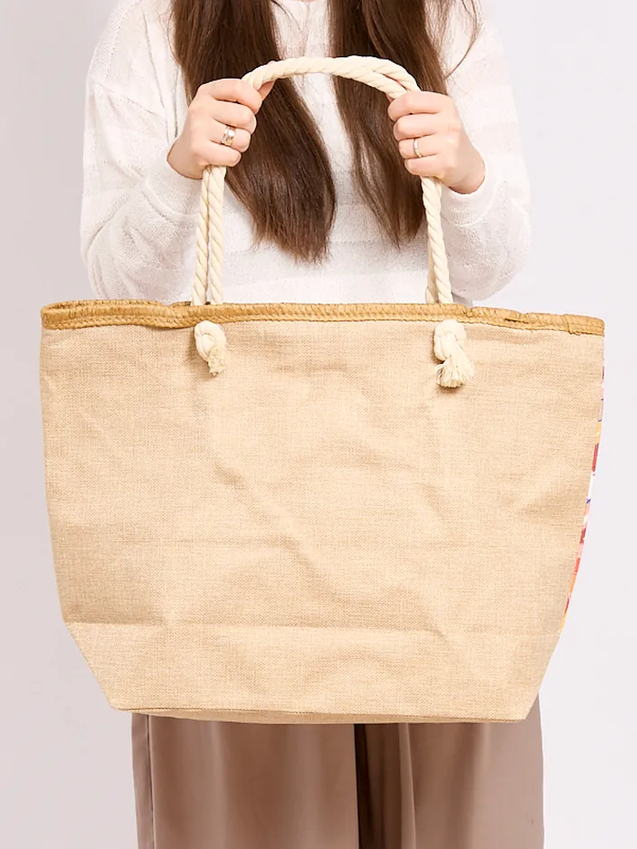 - Sac en tissu élégant fini avec une impression. Le sac a des poignées plus longues, se ferme avec une fermeture éclair et a 1 poche à l'intérieur. Il est parfait pour la plage !