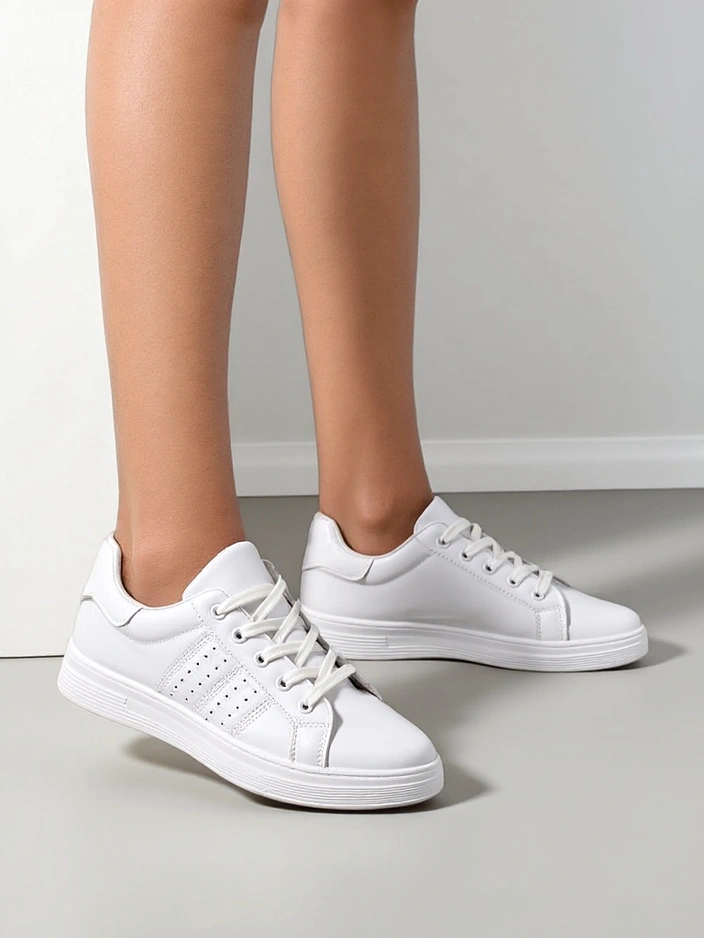 - Chaussures de sport à lacets élégantes pour femme sur une semelle plate. La tige est en cuir écologique. Semelle intérieure en tissu. Des chaussures confortables pour tous les jours !