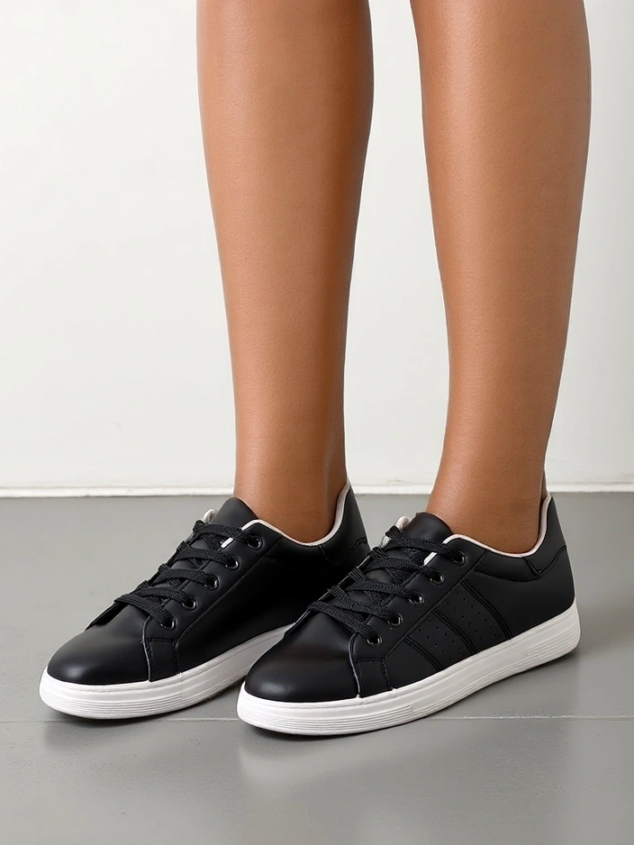- Chaussures de sport à lacets élégantes pour femme sur une semelle plate. La tige est en cuir écologique. Semelle intérieure en tissu. Des chaussures confortables pour tous les jours !