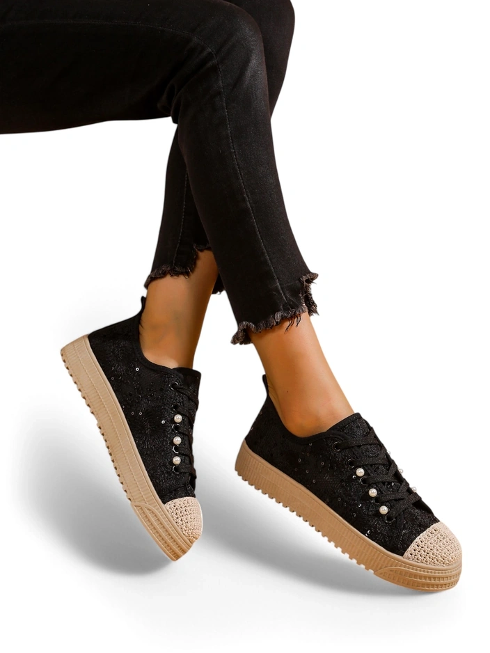 - Chaussures à semelle plate pour femmes. Cette paire au style décontracté est fabriquée en matériau textile avec une finition en dentelle et une semelle intérieure en tissu. Le modèle présente des sequins décoratifs. Parfait pour celles qui attachent de l'