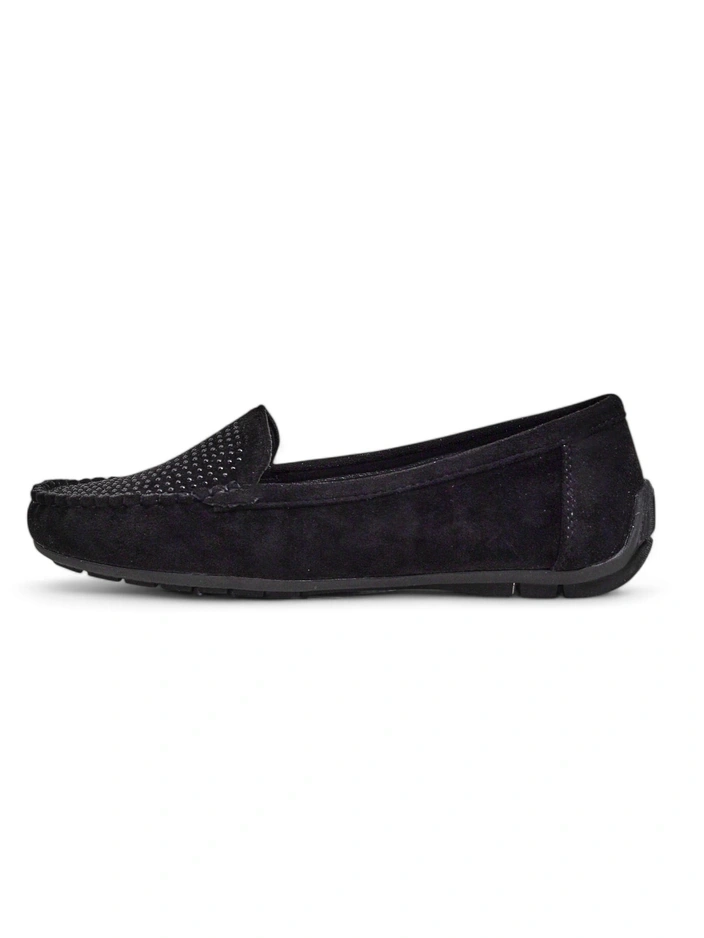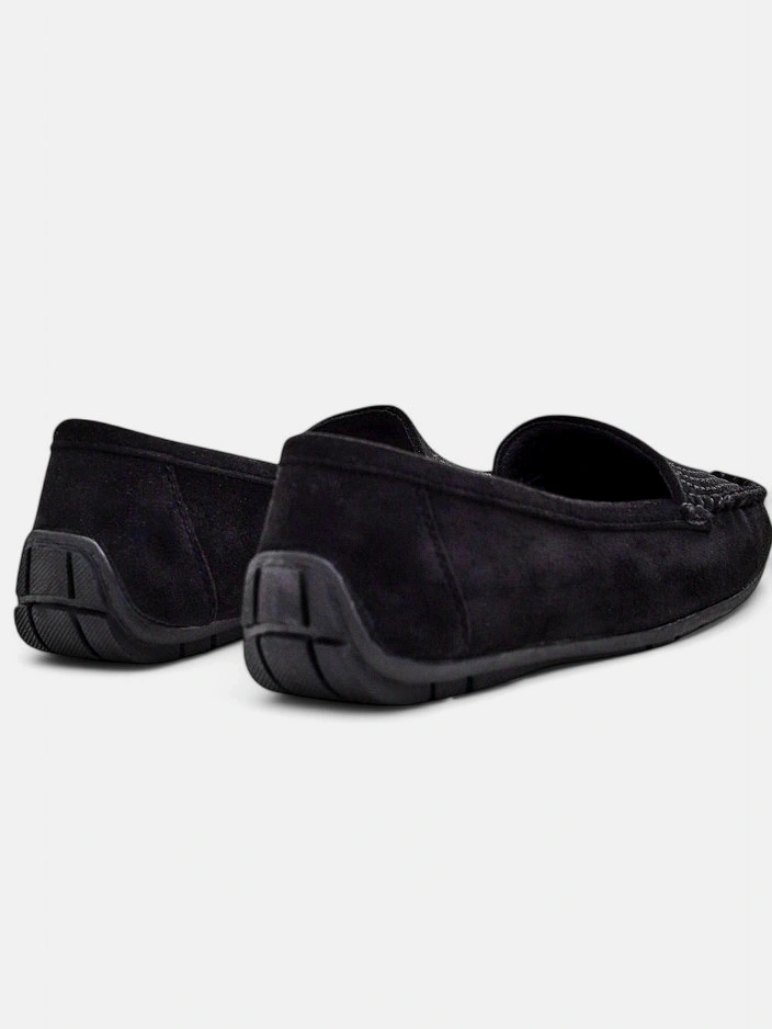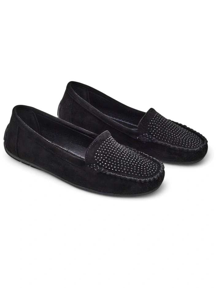 - Magnifiques mocassins pour femmes avec une semelle plate. Le modèle a un style décontracté et est fabriqué en daim écologique et en semelle intérieure en éco-cuir. L'embout est arrondi et décoré de strass. Une base idéale pour de nombreux looks quotidiens