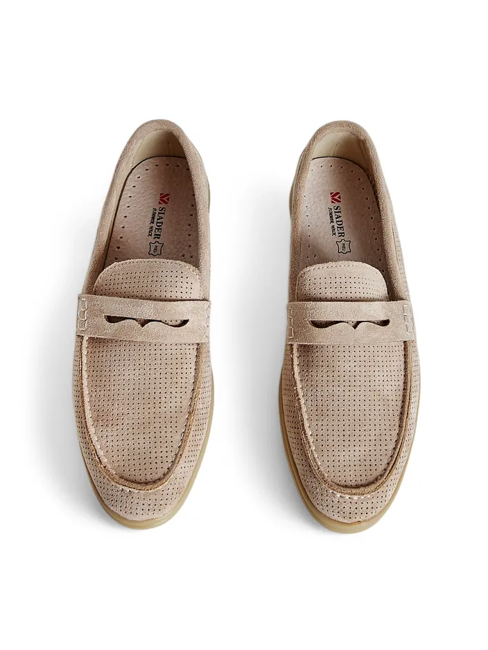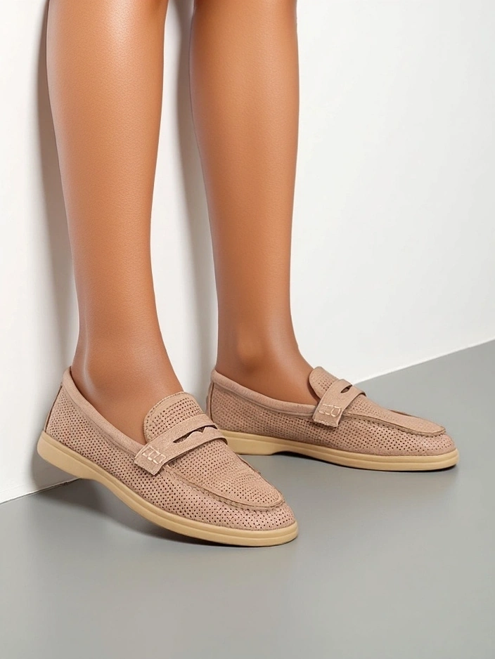- Mocassins perforés pour femmes avec une semelle plate. Modèle en cuir suédé écologique avec une doublure en cuir naturel. Un ajout idéal à vos tenues quotidiennes !