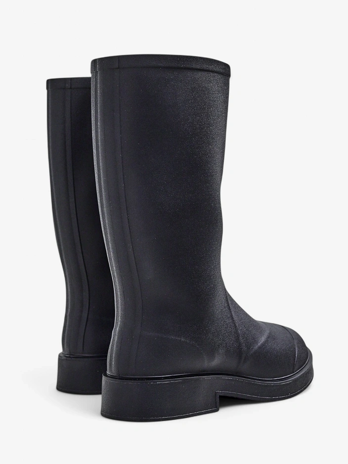 • Élégantes bottes en caoutchouc mates pour femmes avec un talon plat, fabriquées en caoutchouc. À l'intérieur, il y a une semelle en tissu. Parfaites pour les jours de pluie d'automne !