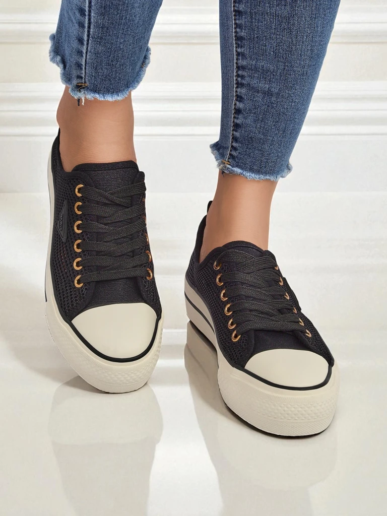 - Klasyczne trampki ażurowe, wnętrze jest wyłożone tkaniną. Bardzo wygodne dzięki gumowej podeszwie. Obuwie pasuje do wielu codziennych stylizacji!
