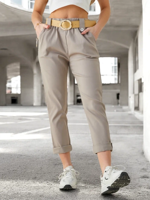 - Pantalons fuselés phénoménaux fabriqués en tissu léger, le modèle a une taille élastique et une ceinture. De plus, il y a 2 poches. Un succès cette saison ! REMARQUE : Précision de mesure (+/-) 1 cm.