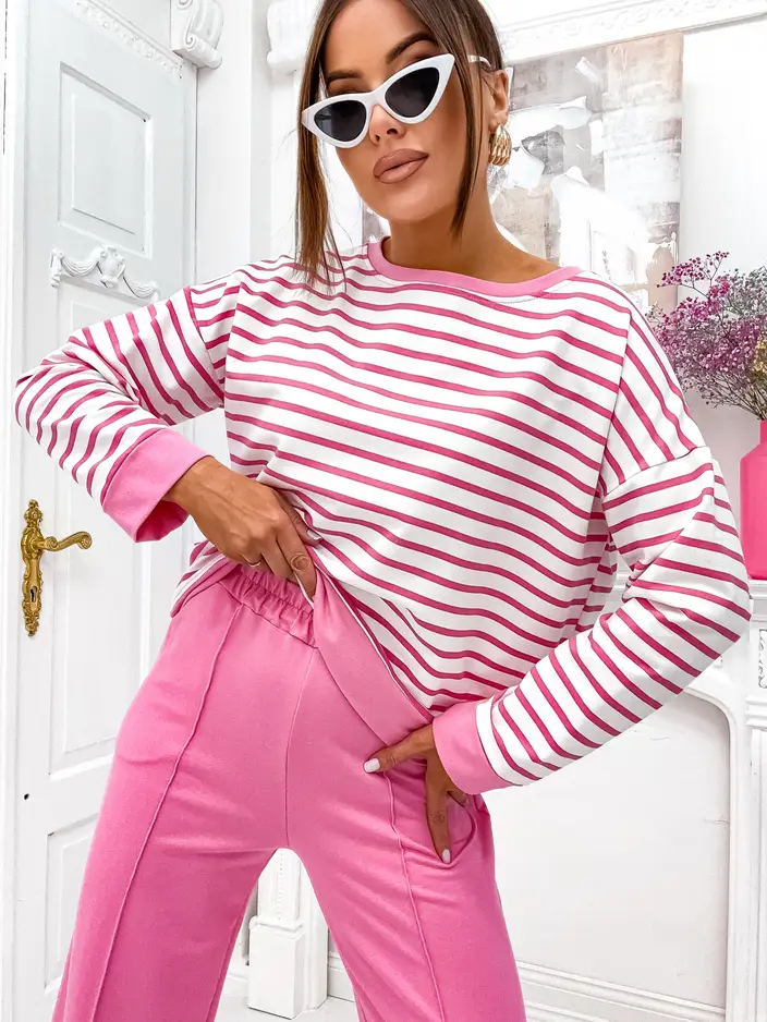 - Ensemble féminin en tissu agréable avec un motif rayé. Sweat-shirt à manches longues sans capuche. Pantalons de survêtement avec taille élastique et 2 poches. Un choix idéal pour un port quotidien !