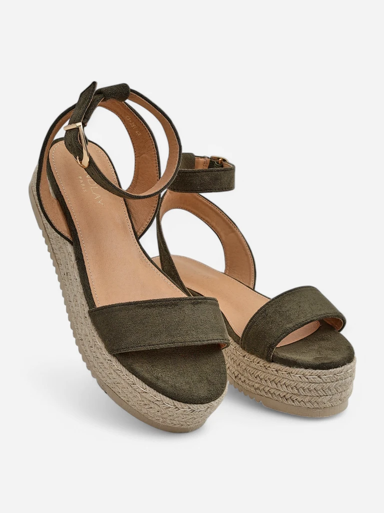• Les sandales sont en suède écologique et possèdent une semelle intérieure en cuir écologique. La chaussure est dotée d'une fermeture à boucle et a une semelle décorative en corde de jute. Parfait pour créer des tenues d'été tendance !