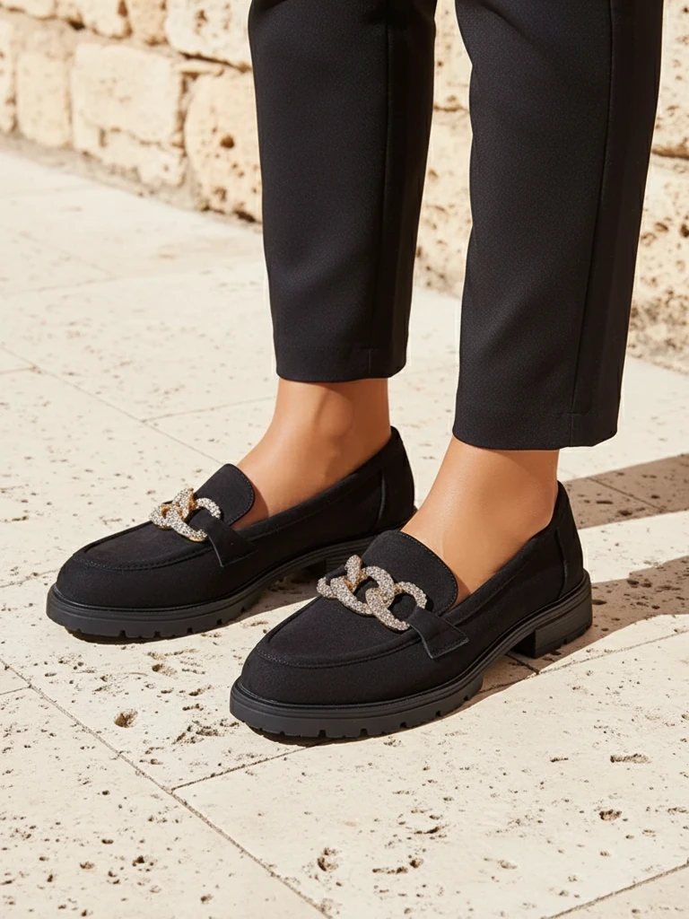 • Mocassins classiques pour femmes avec une semelle plus épaisse. Un modèle classique en cuir suédé écologique et une semelle intérieure en cuir écologique. Les chaussures présentent une décoration élégante sur le dessus. Une base idéale pour le port quotid