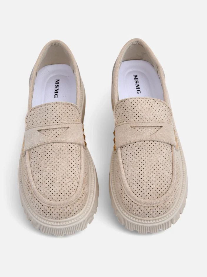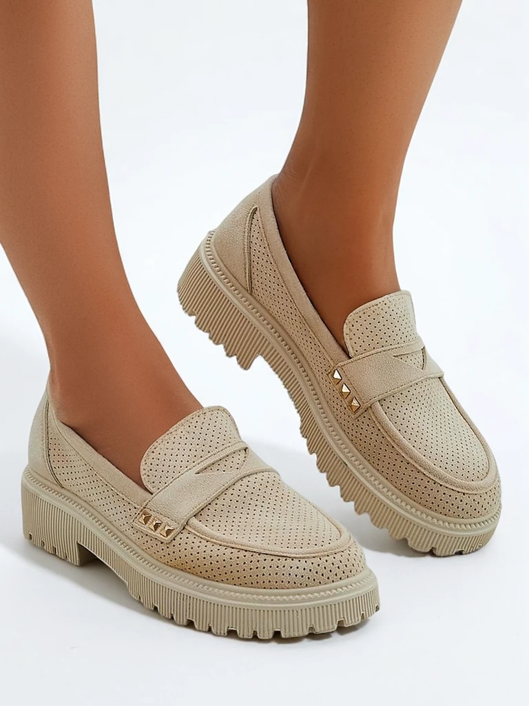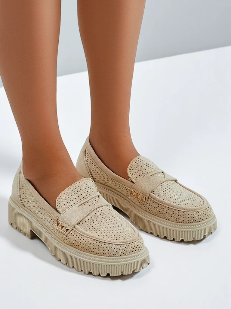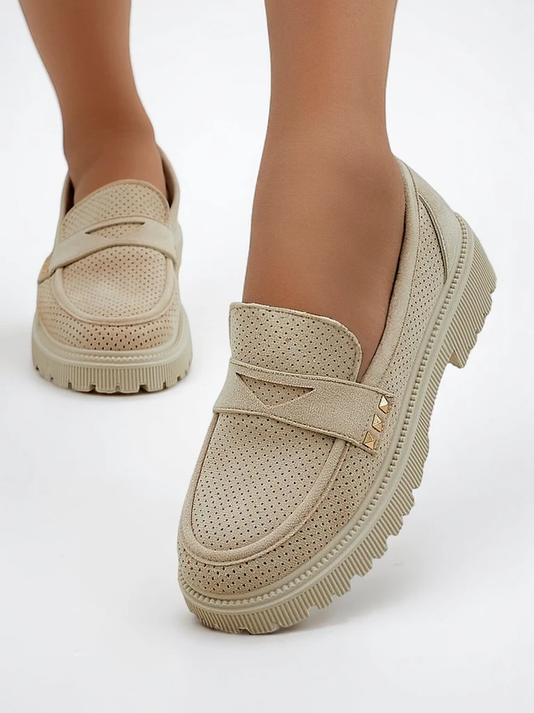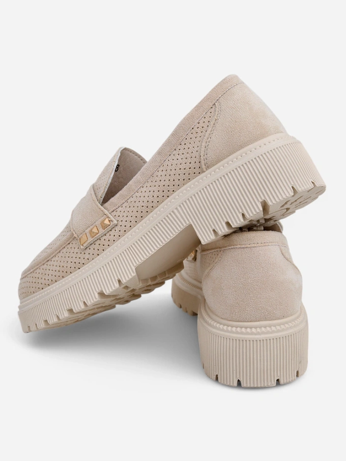 - Mocassins légers pour femmes sur une semelle plate. Le modèle est décontracté et est fabriqué en cuir suédé écologique, avec une semelle intérieure en cuir écologique. Parfait pour les tenues de printemps !