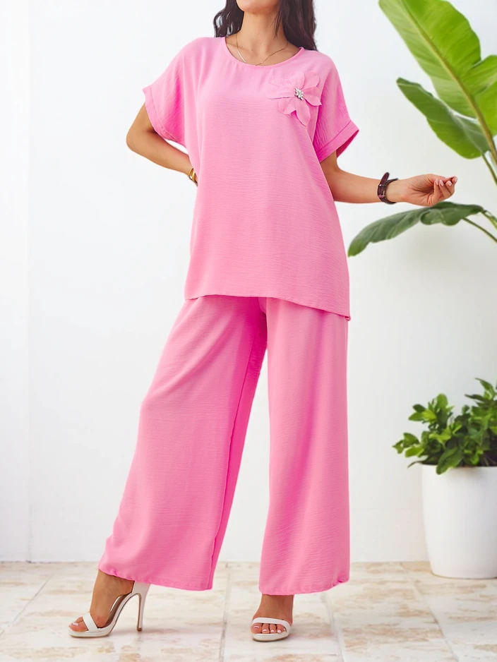 - L'ensemble pour femmes avec des manches courtes, orné d'un motif floral et d'un pantalon large est une combinaison de confort et d'élégance. Parfait pour les jours d'été, il offre une liberté de mouvement et une apparence élégante.