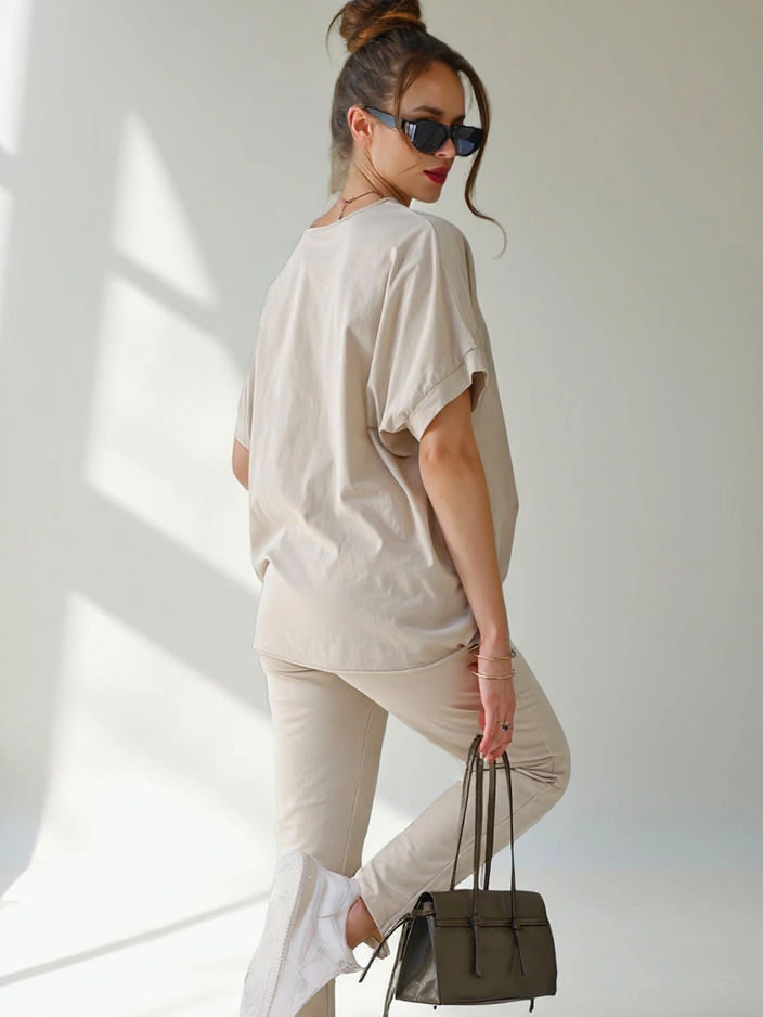 - Ensemble décontracté pour femmes en tissu agréable. Le haut est de style pull-over, avec des manches courtes et un col rond. Pantalons droits avec une taille élastique. Idéal pour ceux qui apprécient le confort.