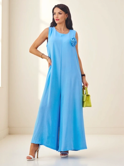 La couleur bleu clair s'inscrit dans les tendances actuelles – les couleurs pastel règnent cet été sur les podiums et dans les rues des capitales mondiales de la mode. La coupe minimaliste avec un décolleté rond, des jambes larges et longues et une fleur décorative sur l'épaule souligne votre féminité et votre style individuel.