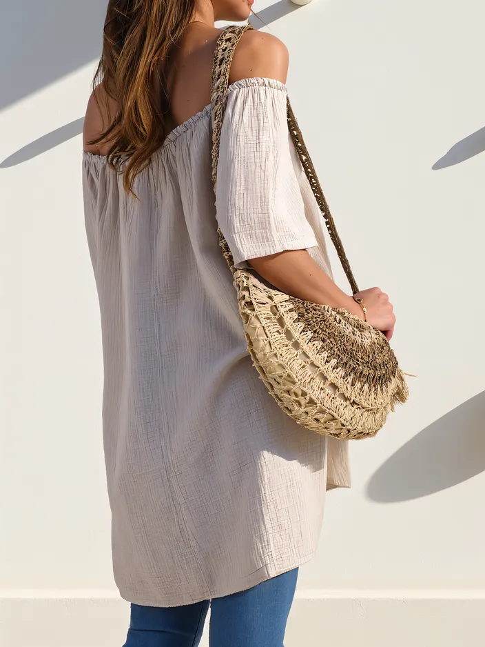 • Élégante blouse en coton pour femmes style espagnol avec de subtils boutons décoratifs. Parfaite pour les journées chaudes, elle allie confort et style féminin, romantique.