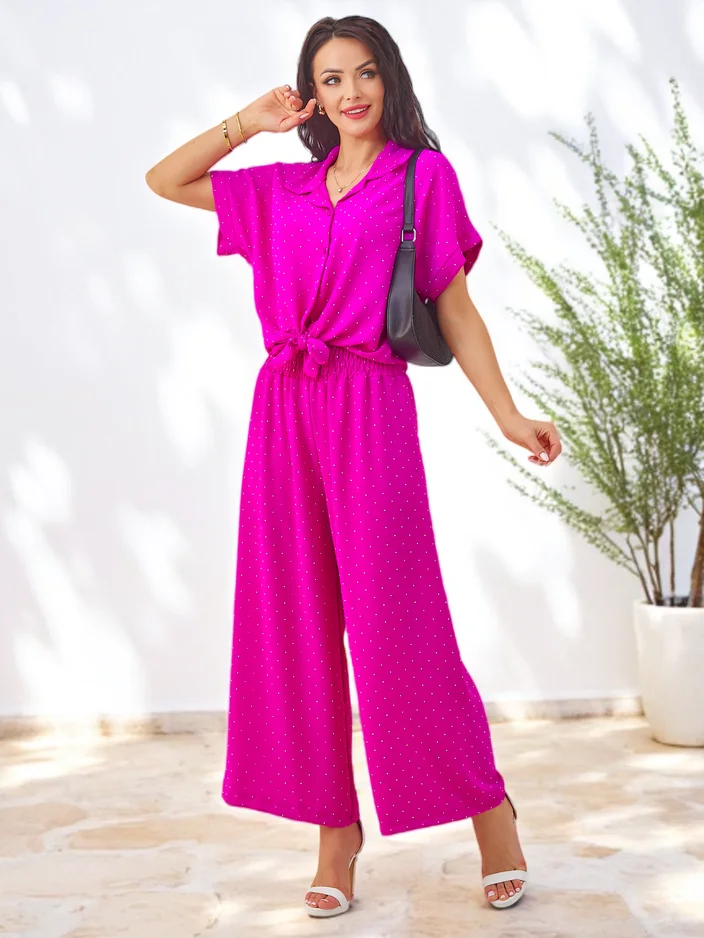 - Ensemble décontracté pour femmes en tissu agréable. La chemise à boutons a un lien en bas et des manches courtes. Pantalon large avec élastique à la taille. L'ensemble est orné de strass !