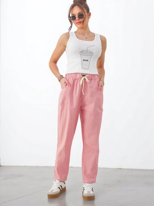 - Pantalon fuselé phénoménal en tissu léger, le modèle possède un élastique et des cordons de serrage à la taille. De plus, il a 2 poches. Un succès de la saison ! REMARQUE : Précision des mesures (+/-) 1 cm.