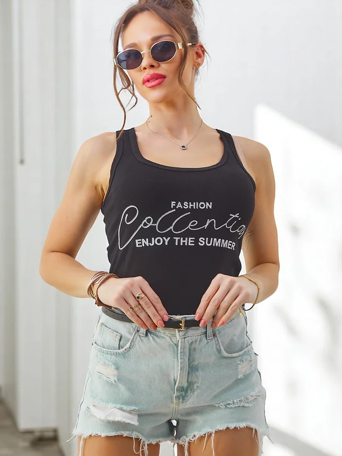 - Débardeur en coton pour femmes avec bretelles, présentant des écrits uniques qui allient confort et design tendance. Léger et respirant, parfait pour les journées d'été et les tenues décontractées.