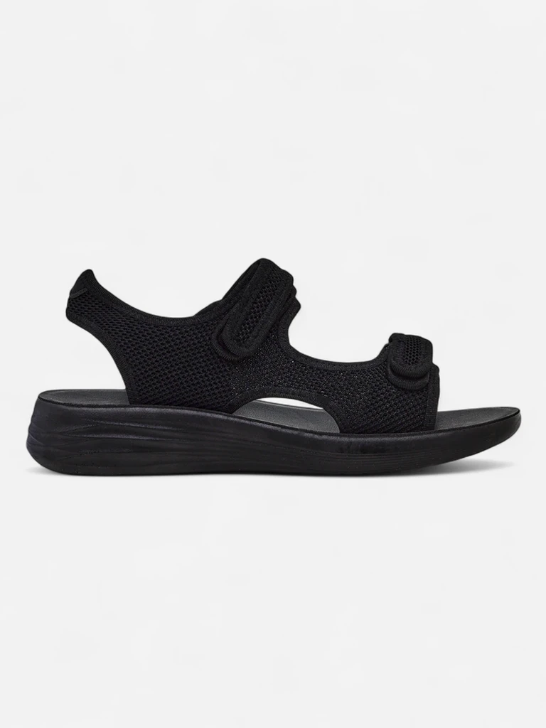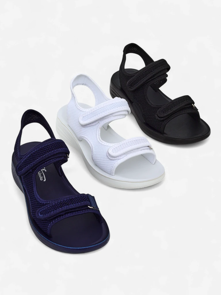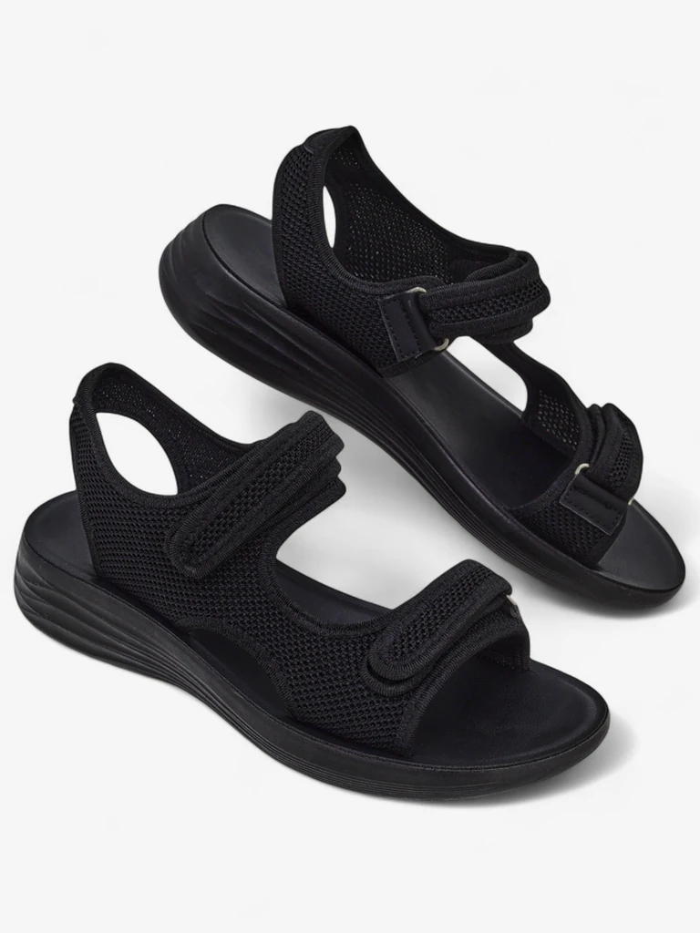 - Sandales de sport pour femmes à semelle plate, avec des brides en tissu et une semelle intérieure en caoutchouc. Ces chaussures pour femmes sont fermées par velcro. Elles adhèrent bien au pied !
