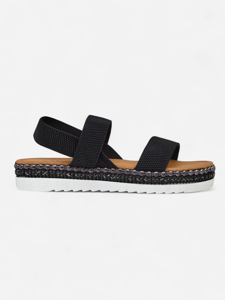 - Sandales pour femmes sur une semelle basse - l'idée parfaite pour les chaudes journées d'été. Le modèle est fabriqué en tissu et en simili cuir. La semelle est décorée de clous décoratifs. Chaussures à enfiler. Une combinaison de style et de confort !