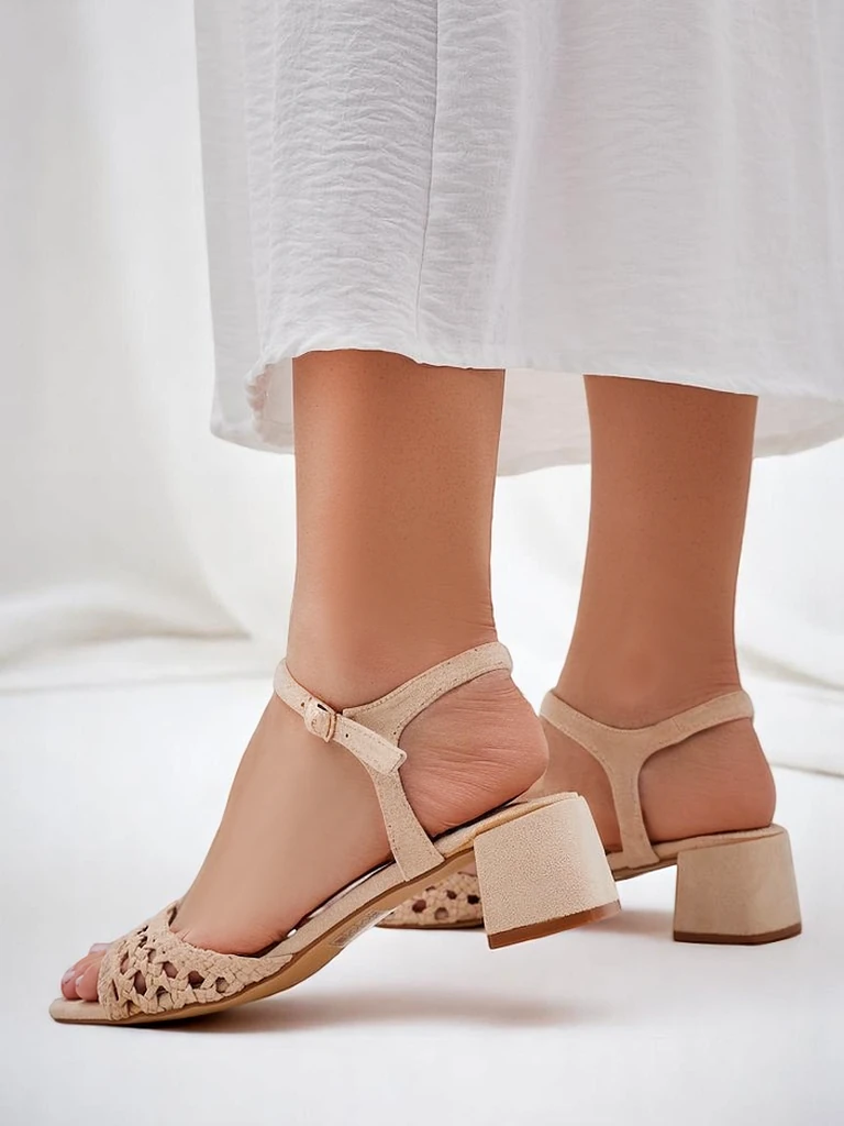 - Sandales à petit talon pour femmes - l'idée parfaite pour les chaudes journées d'été. Le modèle est fabriqué en cuir suédé écologique et dispose d'une semelle intérieure en cuir écologique. Les chaussures se ferment avec une boucle. Une combinaison de sty
