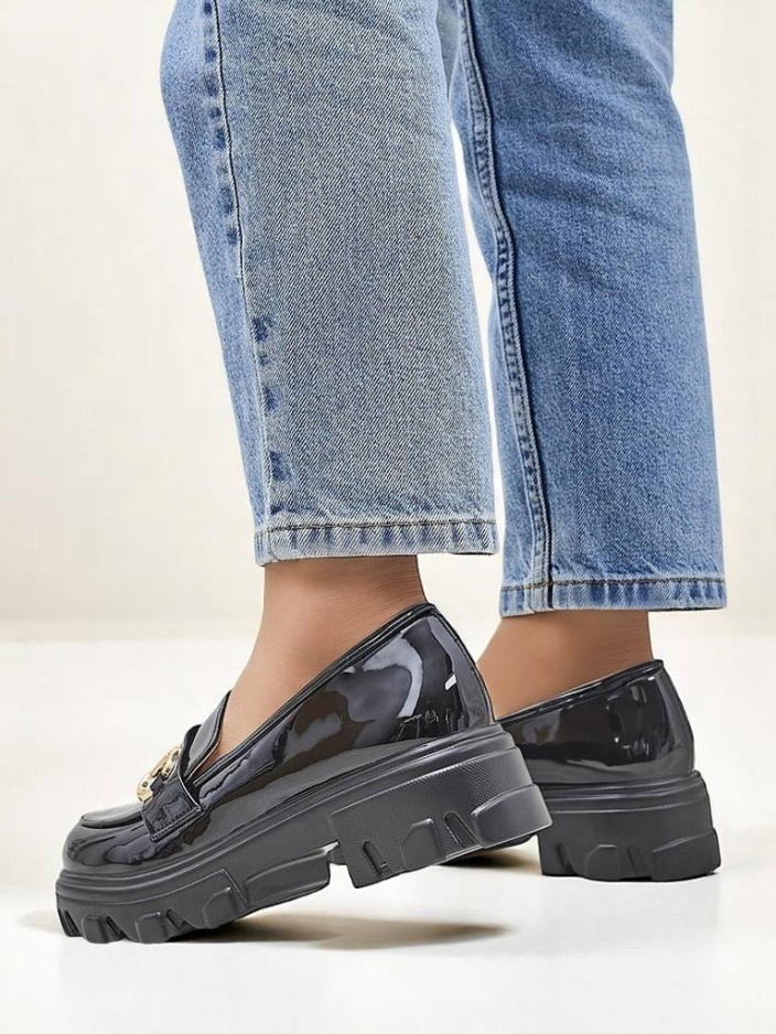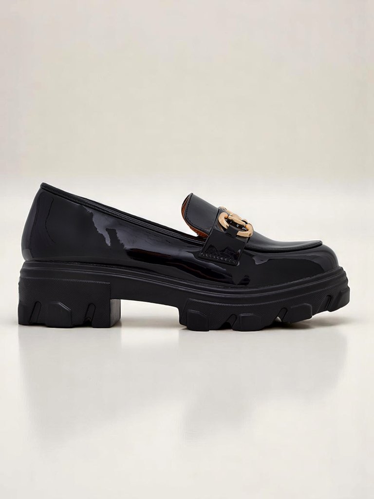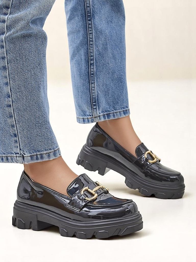 - Mocassins pour femmes en cuir verni sur semelle épaisse avec une élégante décoration dorée. Parfaits pour un usage quotidien et les occasions spéciales.