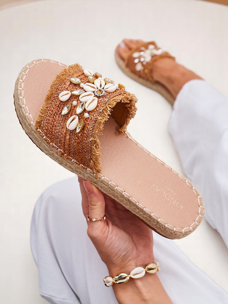 • Des claquettes pour femmes avec des coquillages, fabriquées en tissu, avec une semelle intérieure en cuir écologique et une semelle ornée d'une corde de jute - style et confort pour l'été.