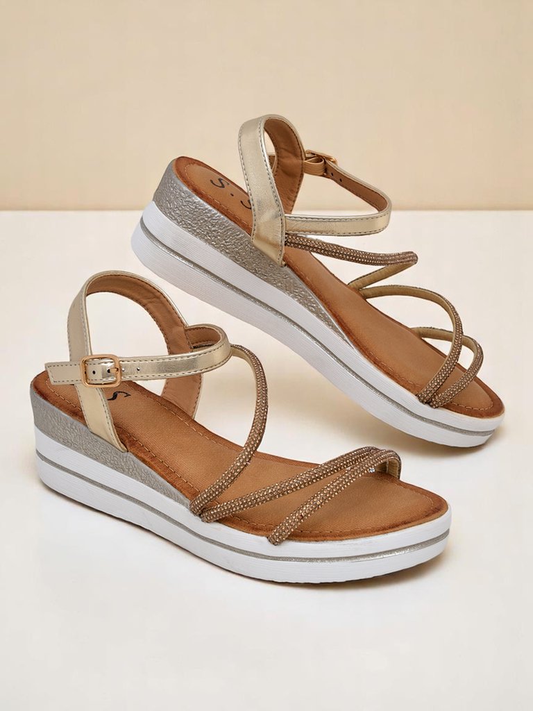 • Découvrez l'élégance avec ces sandales. Sublimes sur le talon compensé, ornées de strass scintillants, elles mettent parfaitement en valeur l'éclat estival. Une combinaison de confort et d'un look luxueux – parfaite pour toute occasion spéciale !
