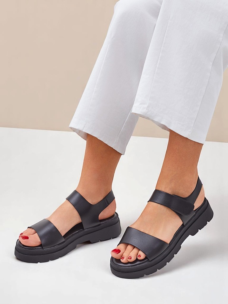 - Sandales plates pour femmes - parfaites pour les chaudes journées d'été. Bride en cuir écologique agréable. Fermeture velcro. Idéales pour un usage quotidien !