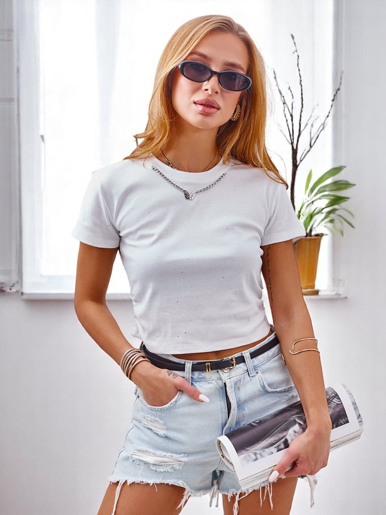 - T-shirt en coton pour femme avec fronces latérales, détail chaîne et paillettes, alliant confort et brillance subtile. Parfait pour les tenues décontractées, il ajoute une touche de charme unique à chaque look.